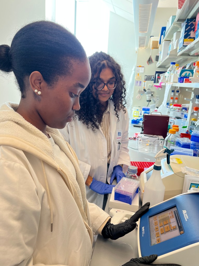 Undergraduate interns Amber and Vrushika working together at the bench